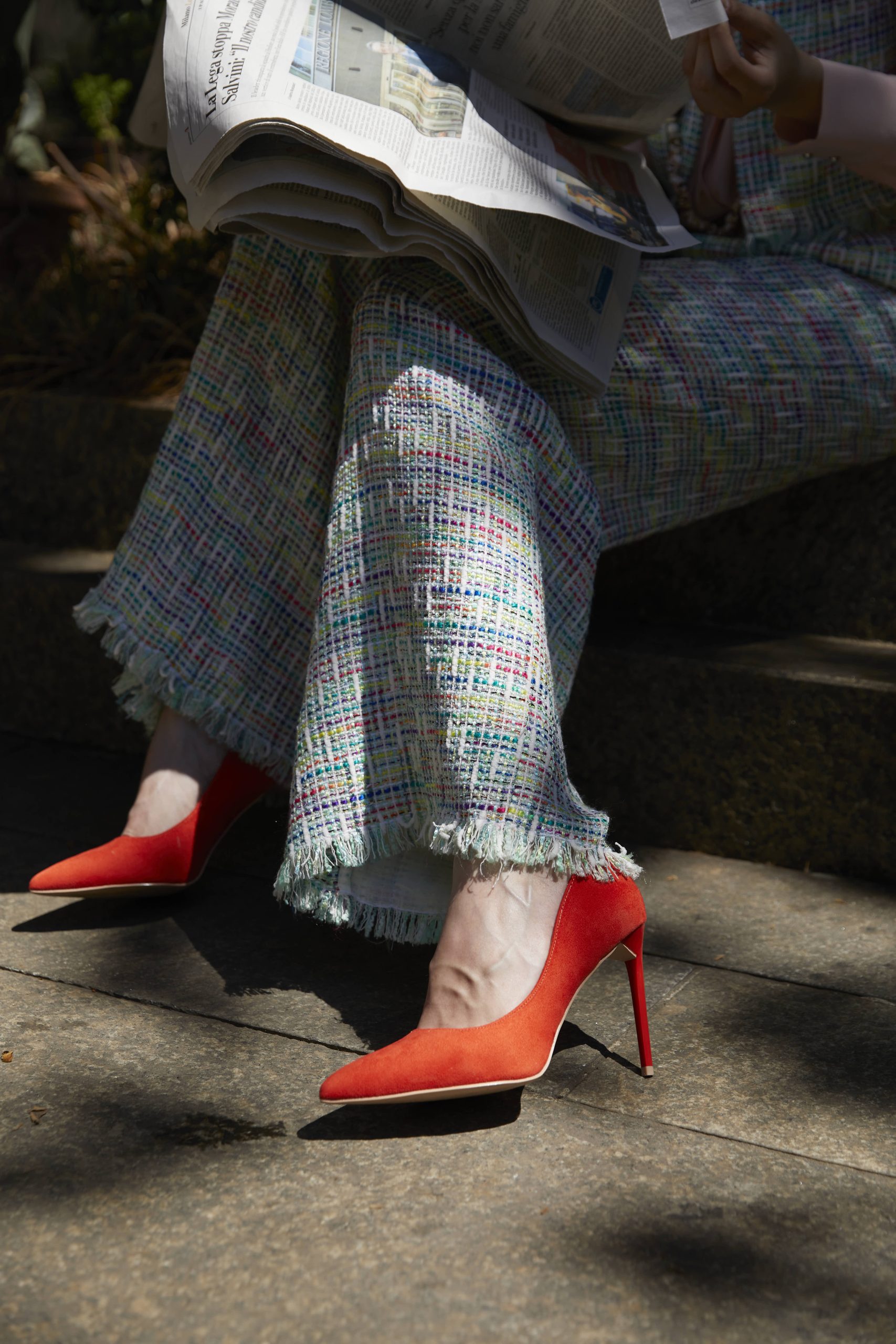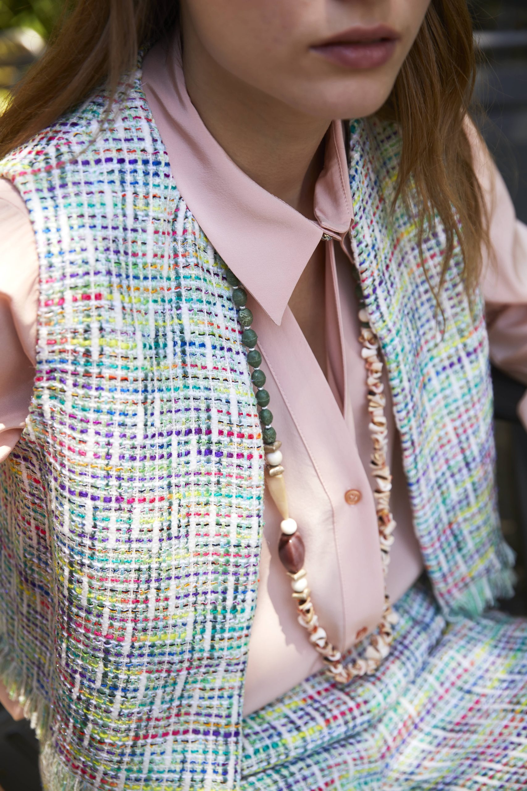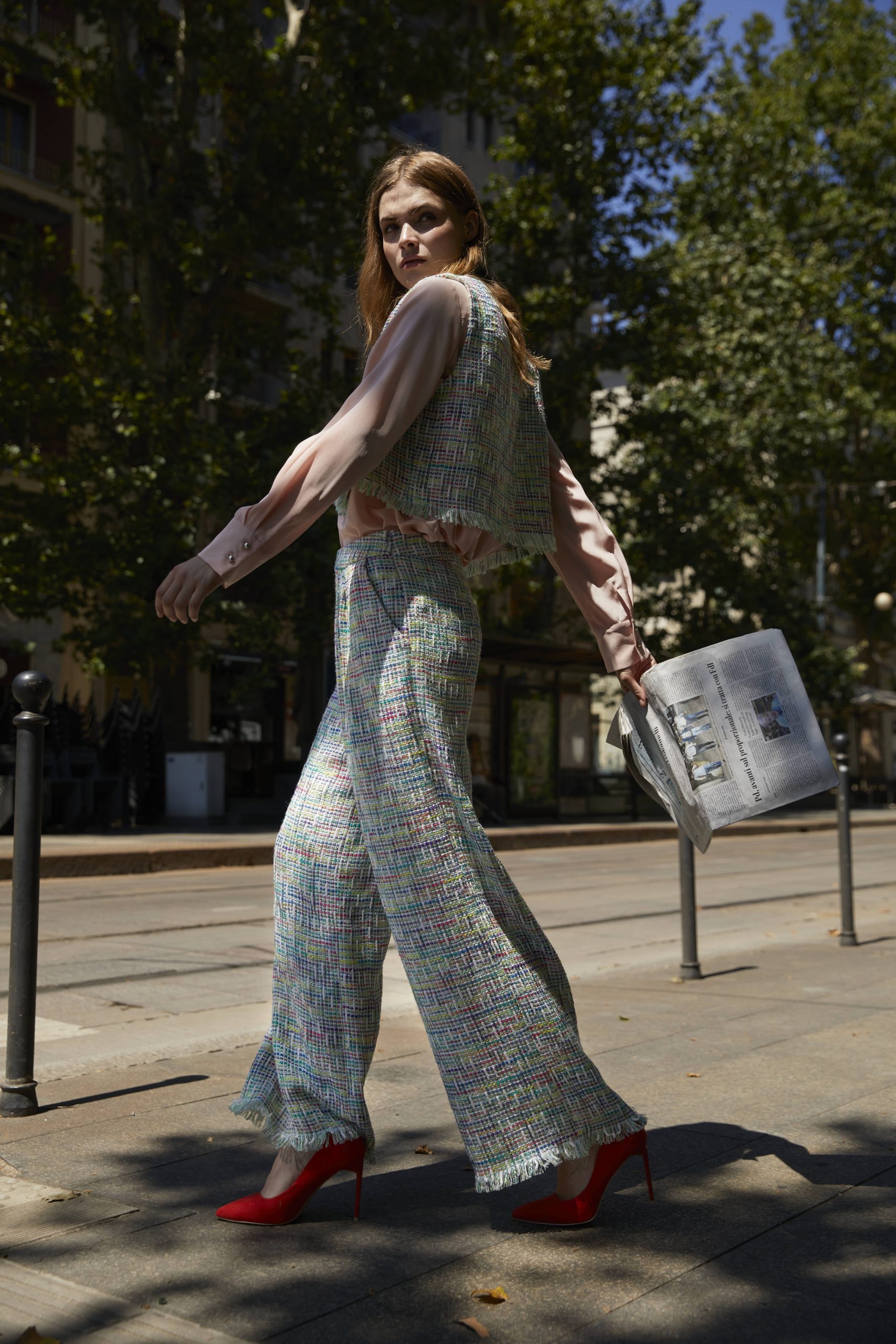 Il completo in tweed multicolor cattura lo sguardo e pone l’attenzione sui tanti dettagli sartoriali, che ne valorizzano l’eleganza.